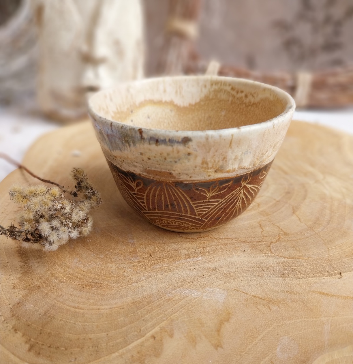 A meleg, földszínű máz és a kézzel vésett minták együtt olyan harmonikus egységet alkotnak, amely minden kortyot ünnepivé tesz.