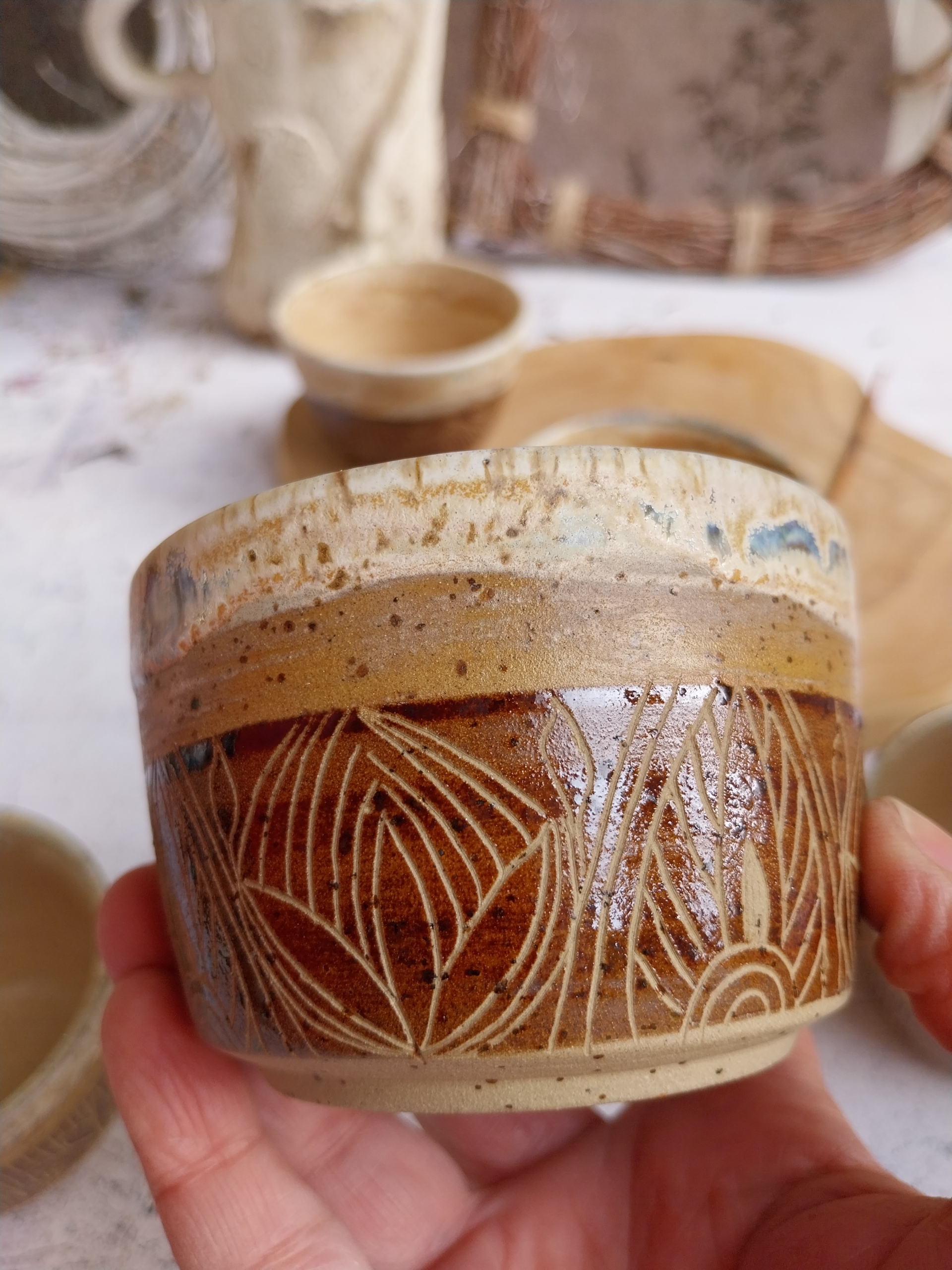 A meleg, földszínű máz és a kézzel vésett minták együtt olyan harmonikus egységet alkotnak, amely minden kortyot ünnepivé tesz.